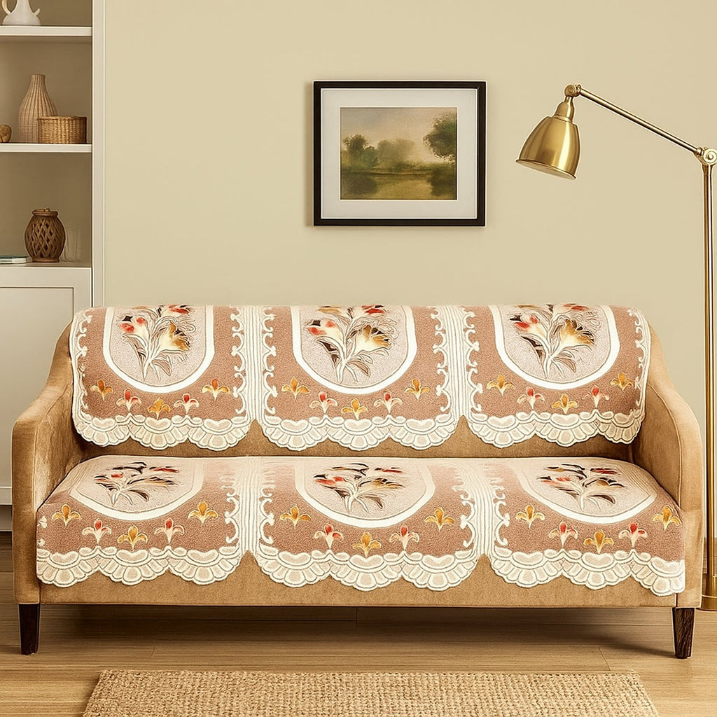 Give your seating a refined, ready-for-guests look while protecting it from everyday wear. This premium sofa runner showcases a classic floral motif framed by ornate scalloped borders that instantly elevates any living room. The soft yet durable textured surface guards your upholstery against dust, crumbs, spills, and pet hair, while laying flat for a neat, tailored finish. Lightweight, foldable, and easy to care for, it spreads across the seat and back in seconds—perfect for busy homes that want style and protection together.