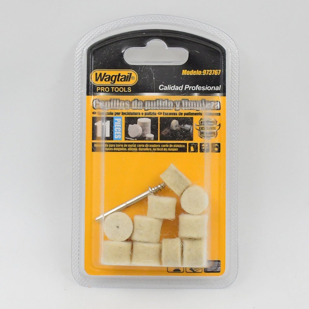 • Wool Felt Mounted Mandrel Set : felt polishing pad in different shape and size, large cylinder shaped, small cylinder shaped, bullets shaped, metal shank.