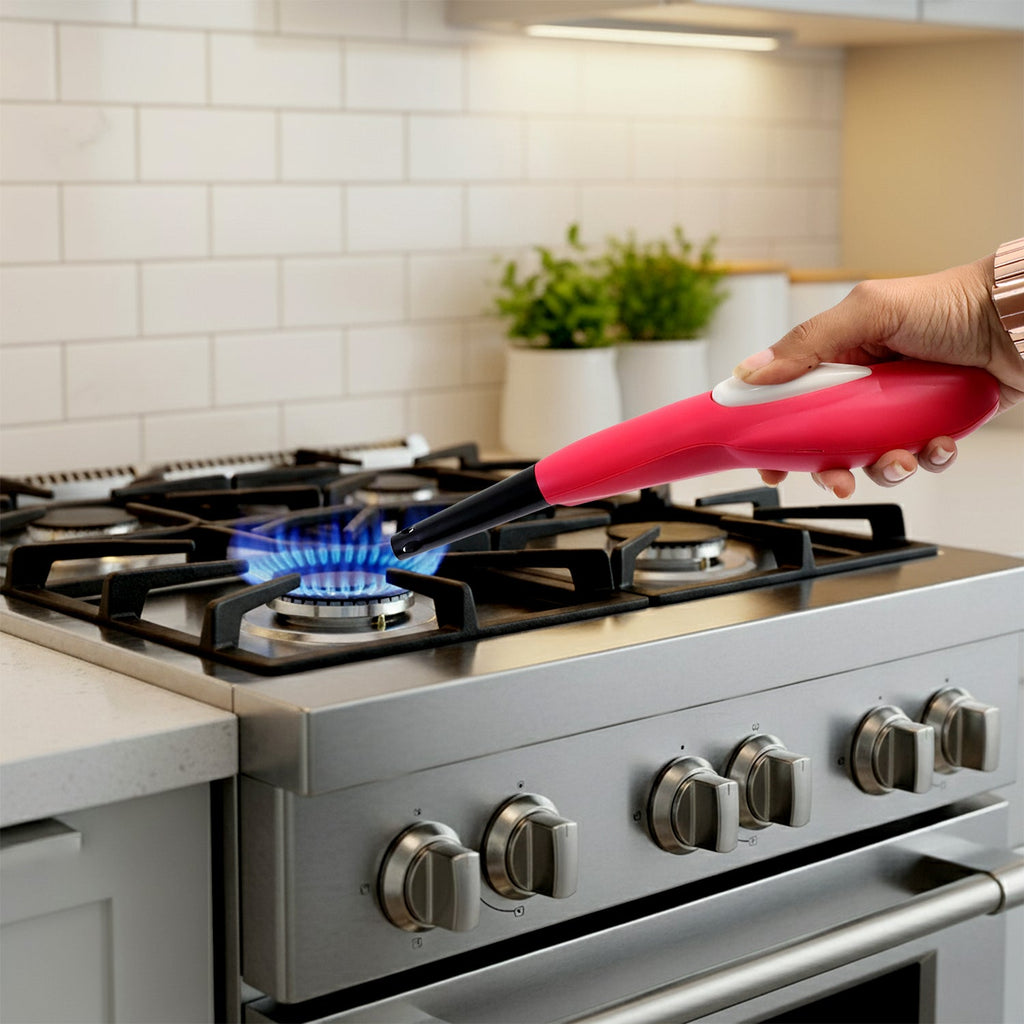 electric gas lighter , battery operated stove lighter , long handle kitchen lighter , automatic spark lighter , flame starter for stove , push-button stove lighter , fire starter for cooking stove , hands-free gas lighter , kitchen tool for safe flame lighting , durable electric spark lighter , lighter for gas burner